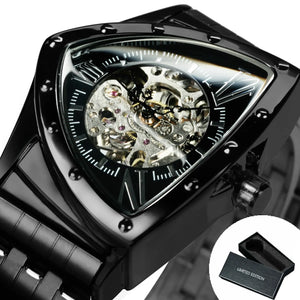 The Triangular Skeleton Watch is a timeless classic with modern flair. Its reverse triangle skeleton movement adds a unique touch to its classic design. The watch's mechanical construction ensures reliability and accuracy, allowing you to enjoy your timepiece for many years to come.